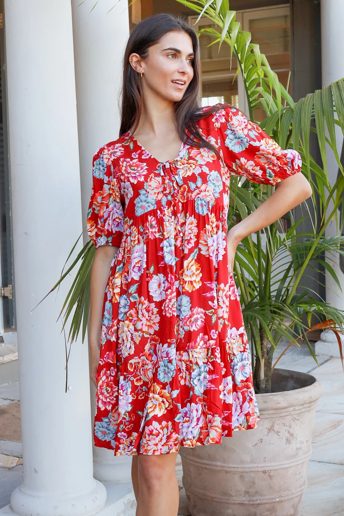 Fabricated in 100% breathable rayon, this striking mini dress from Dreamcatcher is perfect for the hot Summer days. Featuring a tie neckline above a buttoned curved bodice, a tiered skirt and short puff elasticated sleeves, and available in a vibrant red floral print, this boho inspired mini will become a wardrobe favourite.