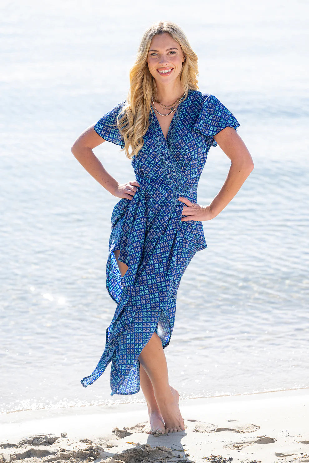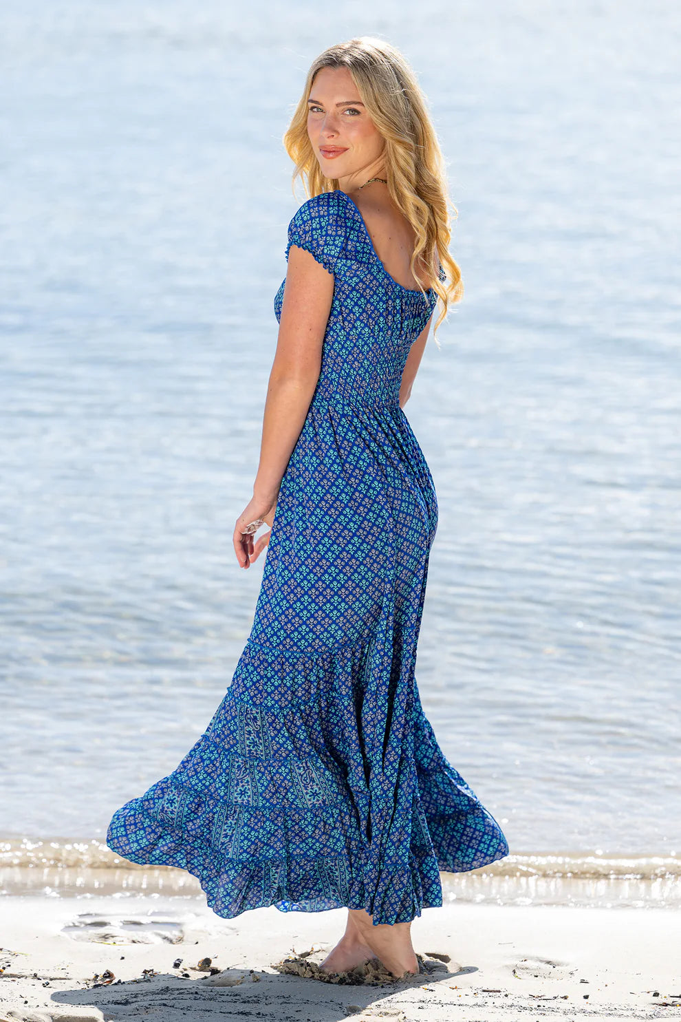 The  Rosa Dress is one of Cienna's most popular maxi dress styles. It has an elastic shirring on the bodice, with sleeves that can be worn on or off the shoulder. This lovely gypsy style  dress has a geometric vibe with tiny flowers in hues of aqua and lilac on a blue background.  This dress has the option to be worn backwards, for a less plunging neckline. It is a silk blend 30%  and 70% polyester.