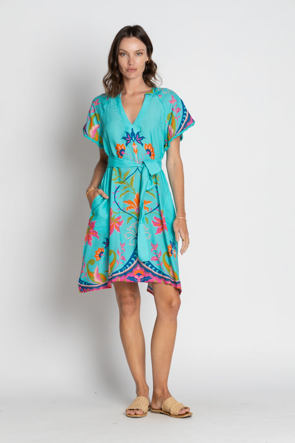 Avaliable in the striking lagoon colourway, the LulaSoul Bahia Dress is the perfect combination of style and comfort. With a relaxed A-line silhouette and fabricated in a luxurious viscose modal, this lightweight dress features a flattering V-neck with a Nehru collar, knee-length hem, and side pockets. The loose raglan sleeves with braid edging add interest, while the optional waist tie allows you to style it your way. Finished with a striking digital scarf placement print, this versatile dress will move effortlessly from daywear to evening.