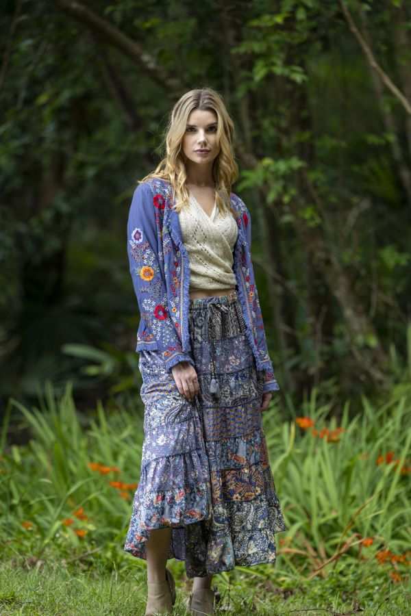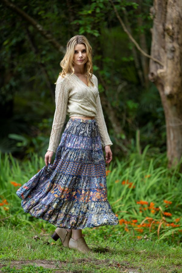 The most fabulous Bohemian Skirt Ever! Made from off cuts of silk blend fabrics. We are doing two tones, either Blues or Pinks.