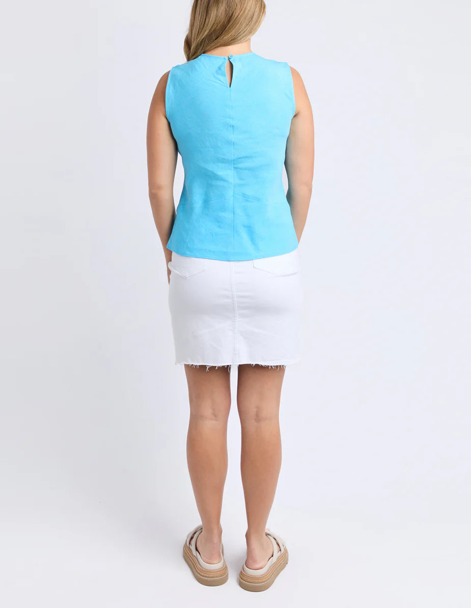 Foxwood's Azure Top is a sleeveless, slim fitting, contoured garment. Crafted from a breathable linen-viscose blend, and expertly designed with a straight through front seam and a v shaped panel on the front to flatter the waistline.