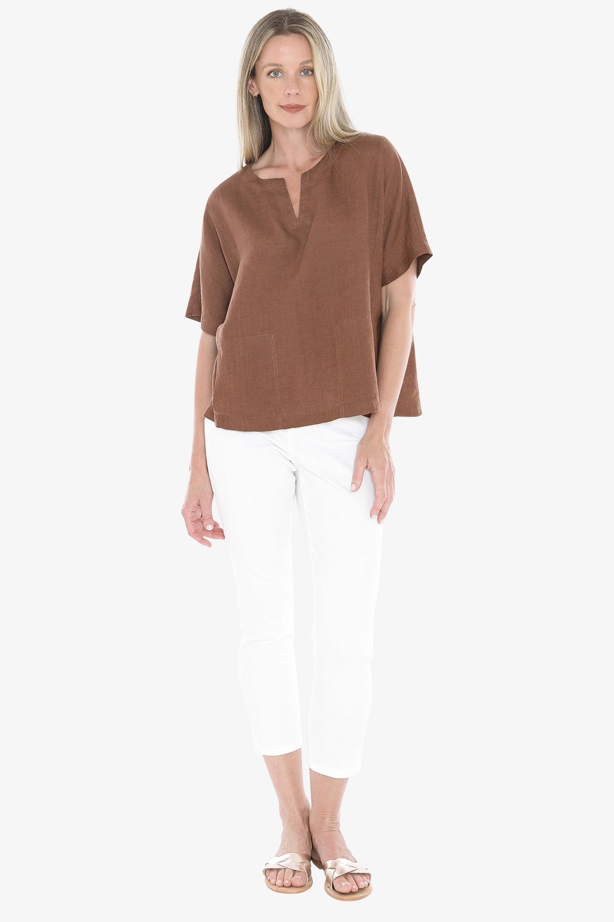 The Two Pocket Linen Top is designed with a relaxed silhouette, offering effortless style and comfort.