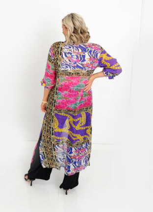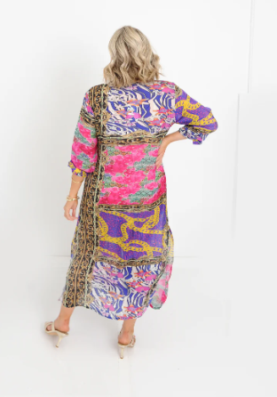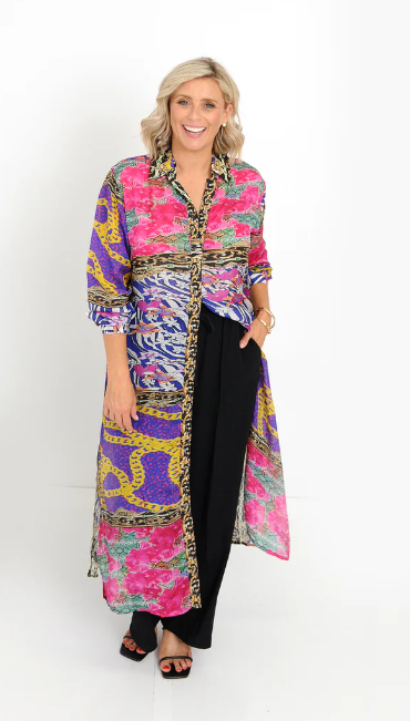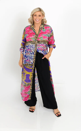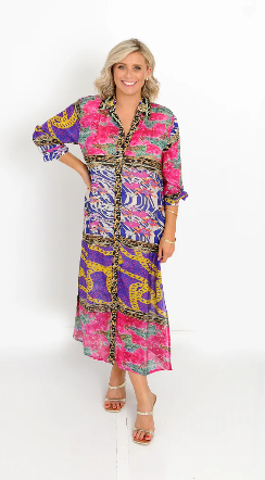 This 100% silk shirt dress is incredibly versatile. Can be worn with slides or styled as a duster over your favourite basics in winter.